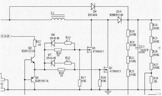 圖1所示;是三星V2屏等離子開關電源的PFC激勵部分。從圖中可以看出;這是一個并聯開關電源L1是儲能電感,D10是這個開關電源的整流二極管,Q1、Q2是開關管,為了保證PFC開關電源有足夠的功率輸出,采用了兩只MOS管Q1、Q2并聯應用(圖2所示;是該并聯開關電源等效電路圖,圖中可以看出該并聯開關電源是加在整流橋堆和濾波電容C5之間的),圖中Q3、Q4是灌流激勵管,Q3、Q4的基極輸入開關激勵信號, VCC-S-R是Q3、Q4的VCC供電(22.5V)。