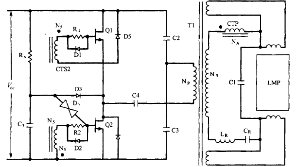 在導(dǎo)通霎時(shí)就是由于較低的尺而招致了電流沖擊。在燈點(diǎn)亮以 后,燈管的阻抗會(huì)降落 ,Q 增加,R,也增加,從而電流就會(huì)調(diào)整為預(yù)定功率時(shí)的輸出值 。電流變壓器的初級(jí)調(diào)和振電感Lr、諧振電容Cr相串聯(lián),這樣增加了導(dǎo)通阻抗,有利于在開(kāi)端的時(shí)分降低電流的沖擊。電流變壓器是基極比例驅(qū)動(dòng)變壓器(8.3.5節(jié))。其臣比NA/N,設(shè)計(jì)為最小的晶體管P值。這通常確保了在一切的電流程度下都有足夠的基極驅(qū)動(dòng)。由于極電極和基極的電流比剛好就是變壓器的臣比,這會(huì)保證在高電流輸出下有足夠的基極驅(qū)動(dòng),而在低電流輸出時(shí)則能夠降低基極驅(qū)動(dòng)以減少存儲(chǔ)時(shí)間。剛開(kāi)端導(dǎo)通時(shí),電路的振蕩頻率是 1/(卻在刃,Ce 是 Cr和Cl的串聯(lián)值,其值為ClCr/(Cl+Cr)。當(dāng)燈管點(diǎn)亮?xí)r,由于Cl與較低的阻抗并聯(lián),所以電路的諧振頻率降為 1/(勿在已。啟動(dòng)電路包括 R 、C,和 DY o D3 的工作相似于16.8節(jié)中的并聯(lián)半橋諧振電路,C4是一個(gè)隔直電容 。總而言之,該電路和電流饋電電路一樣并不容易剖析設(shè)計(jì)。設(shè)計(jì)時(shí)并沒(méi)有足夠的把握保證曾經(jīng)思索到了最壞的狀況,也不能保證同終身產(chǎn)線上的產(chǎn)品都是一樣的 。由于啟動(dòng)時(shí)的瞬 態(tài)過(guò)程和各個(gè)工作模態(tài)下的等效電路很難肯定 ,并且燈管電流準(zhǔn)確值也不容易計(jì)算出來(lái) 。