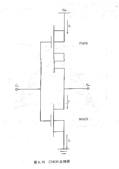 如圖6. 28所示,CMOS反相器為CMOS邏輯電路的基本單元.在CMOS反相器中,p與n溝道晶體管的柵極銜接在一同,并作為此反相器的輸入端,而此二晶體管的漏極也連接在一同,并作為反相器的輸出端.n溝道MOSFET的源極與襯底接點均接地,而p溝道MOSFET的源極與襯底則銜接至電源供應(yīng)端(VDD),需留意的是p溝道與n溝道MOSFET均為增強型晶體管,當輸入電壓為低電壓時(即vin=O,VGsn=o