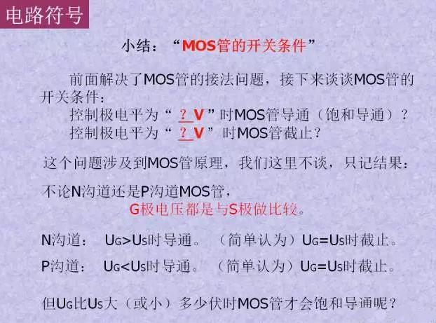 MOS管為壓控元件,你只要加到它的壓控元件所需電壓就能使它導(dǎo)通,它的導(dǎo)通就像三極管在飽和狀態(tài)一樣,導(dǎo)通結(jié)的壓降最小.這就是常說(shuō)的精典是開關(guān)作用.去掉這個(gè)控制電壓經(jīng)就截止. MOS管 MOS管的英文全稱叫MOSFET(Metal Oxide Semiconductor Field Effect Transistor),即金屬氧化物半導(dǎo)體型場(chǎng)效應(yīng)管,屬于場(chǎng)效應(yīng)晶體管中的絕緣柵型。因此,MOS管有時(shí)被稱為場(chǎng)效應(yīng)管。在一般電子電路中,MOS管通常被用于放大電路或開關(guān)電路。而在主板上的電源穩(wěn)壓電路中,MOSFET扮演的角色主要是判斷電位,它在主板上常用“Q”加數(shù)字表示。