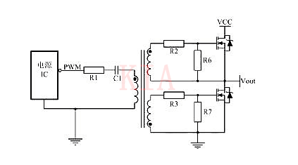 為了滿足如圖 5所示高端MOS管的驅動,經常會采用變壓器驅動,有時為了滿足安全隔離也使用變壓器驅動。