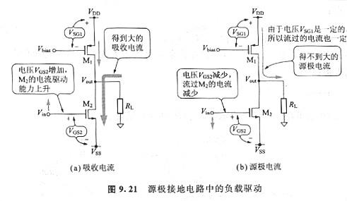 如圖9.21(a)所示,當Vout降低,自RL流入輸出端的電流(吸收電流)增加時,n溝MOS晶體管M2的柵極電壓上升。就是說,VGS2增加,M2的電流驅(qū)動才干增強,能夠流過大的吸收電流。