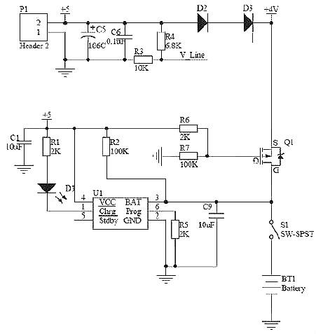 圖1 如圖1所示,使用了P溝道的內(nèi)置二極管的電路,此處二極管的主要作用是續(xù)流作用,電路是鋰電池充放電電路,當(dāng)外部電源斷開時(shí)采用Li電池進(jìn)行內(nèi)部供電,即+5V電源斷開后Q1的G極為低電平,S極和D極導(dǎo)通,為系統(tǒng)供電。圖中D2和D3的一方面是降壓的作用,使5V降為4V(D2為鍺管壓降為0.2V,D3硅管壓降為0.7V)。