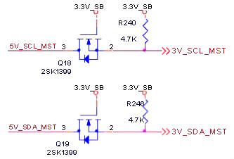 此電路是應(yīng)用于開關(guān)時(shí)序的,當(dāng)3.3V_SB為低電平時(shí)Q18、Q19不導(dǎo)通,5V時(shí)鐘數(shù)據(jù)轉(zhuǎn)3.3V時(shí)鐘數(shù)據(jù)不導(dǎo)通;當(dāng)3.3V_SB為高電平時(shí)5V時(shí)鐘數(shù)據(jù)轉(zhuǎn)3.3V時(shí)鐘數(shù)據(jù)。
