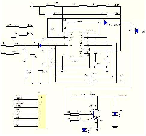 輸出脈沖的寬度是通過電容CT上的正極性鋸齒波電壓與另外兩個控制信號進行比較來實現。功率輸出管Q1和Q2受控于或非門。當雙穩觸發器的時鐘信號為低電平時才會被選通,即只有在鋸齒波電壓大于控制信號期間才會被選通。當控制信號增大,輸出脈沖的寬度將減小。(7)腳接地端,(8)、(11)腳是Q1和Q2內部開關管的集電極,在此電路中接電源,(9)、(10)腳為Q1、Q2的發射極,作開關管驅動輸出端,接下圖中Q1與Q2外部放大電路。以驅動后極推挽電路。(12)腳電源端,(13)腳為輸出控制端,接(14)腳基準電壓時兩路輸出脈沖相差180方位,每路輸出量大約200MA的驅動推挽或半橋式電路。(15)、腳第二組放大器的反相輸入端,接基準電壓, (16)腳同相輸入端,檢測電源電壓。當電壓過高超過(15)腳參考電壓時,(3)腳輸出高電平,電路進入保護狀態。