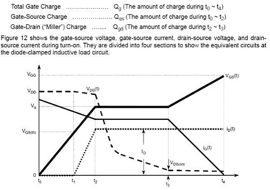 Qgs從0電荷開始到第一個拐點處,Qgd是從第一個拐點到第二個拐點之間部分(也叫做“米勒”電荷),Qg是從0點到vGS等于一個特定的驅(qū)動電壓的部分。