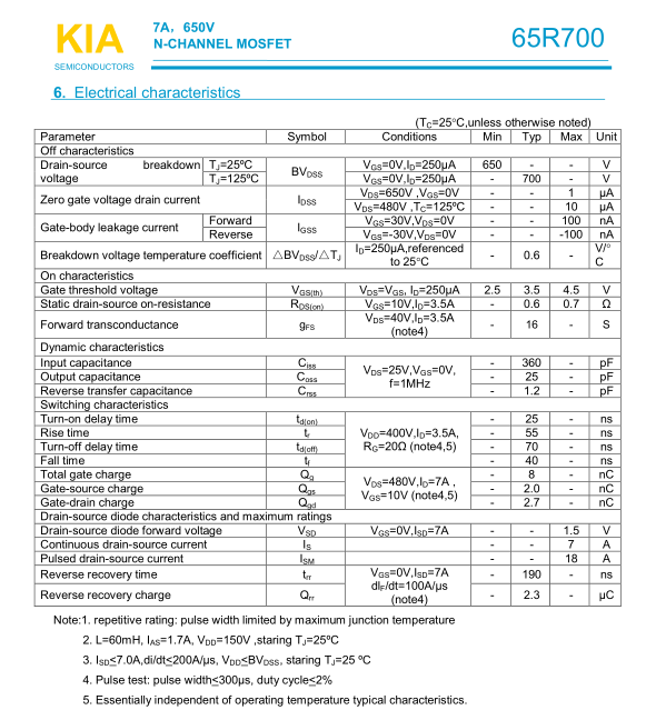 參數: ID(A): 7 BVDSS(V): 650 RDS(ON): 0.6 Qg(nC): 8 Package: TO-251、252、220F