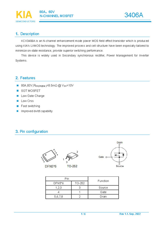 參數: ID(A): 80 BVDSS(V): 60 RDS(ON): 8.5mΩ Qg(nC): 16.8 Package: DFN5*6/TO-252