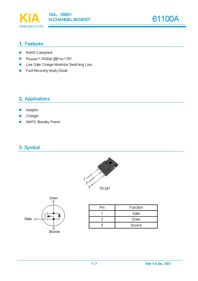 參數: ID(A): 10    BVDSS(V): 1000    RDS(ON): 1.0Ω    Qg(nC): 71    Package: TO-247