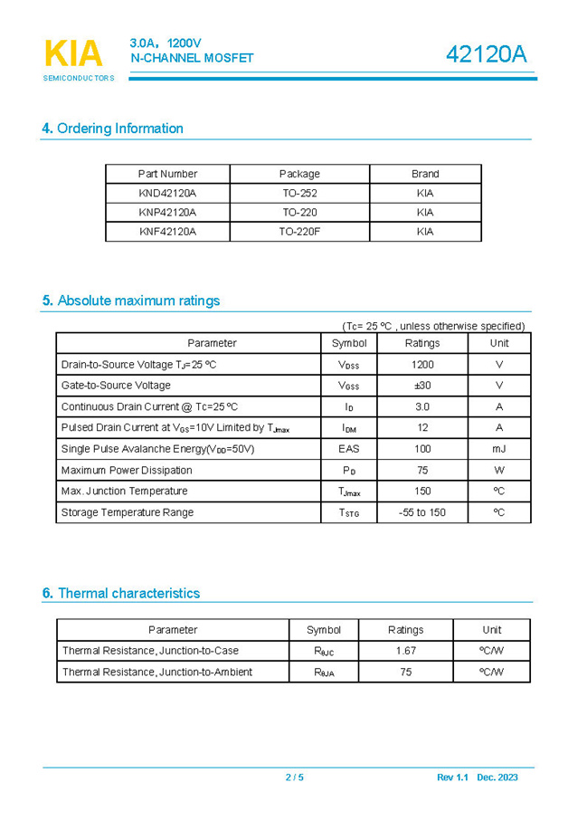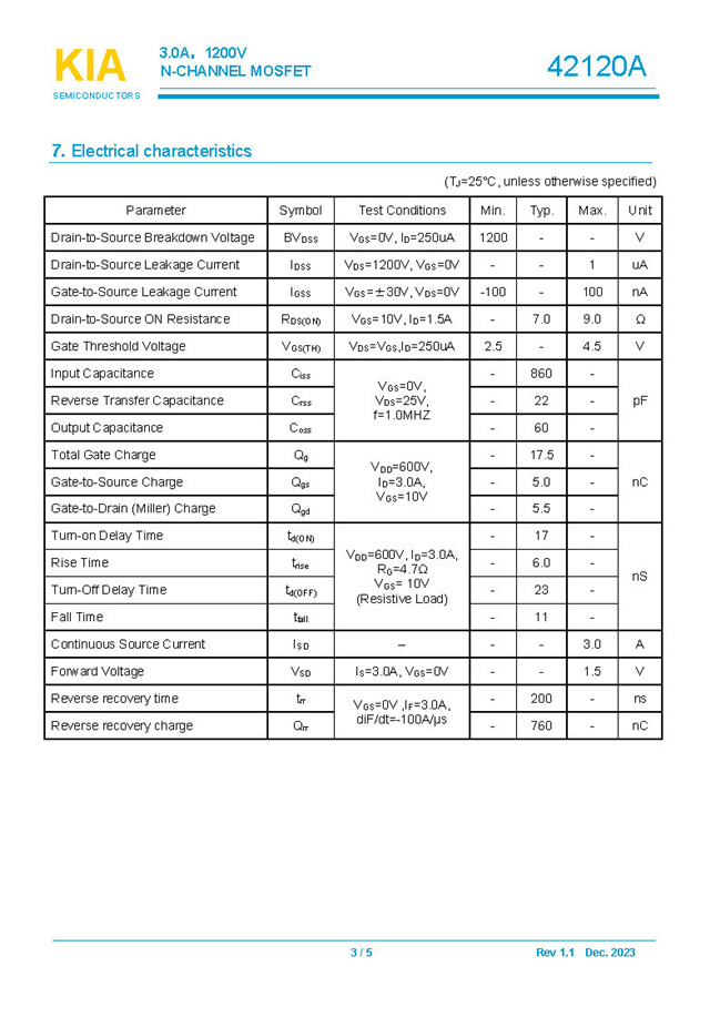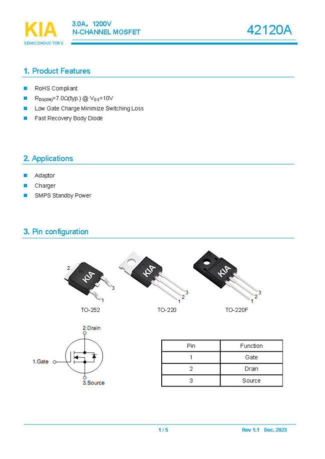 參數: ID(A): 3    BVDSS(V): 1200    RDS(ON): 7.0Ω    Qg(nC): 17.5    Package: TO-252.TO-220.TO-220F